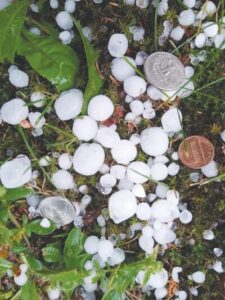 Weather watcher Josiah Avery reports that the hail size ranged from pea size to quarter size pellets of ice. Sadly, Josiah’s garden was a complete loss.